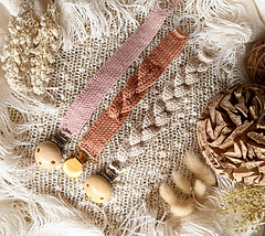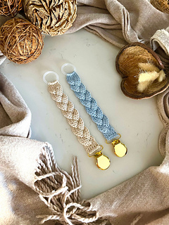 A unique crochet pacifier clip pattern set made with the Tunisian crochet technique for a beautiful knit-like texture.