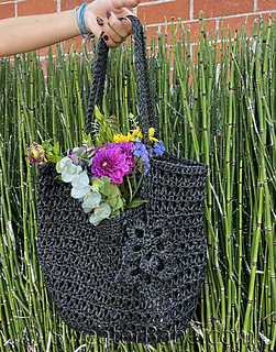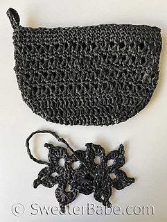 The yarn is a synthetic, raffia-like ribbon I discovered on Amazon that turned out to be an absolutely perfect choice! One cone has more than enough yardage for the whole bag, plus the adorable double-flower charm shown here (flower charm instructions in a separate download).