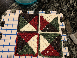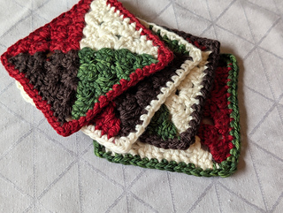 Use the yarn and hooks that you prefer for your Granny Squares. The coasters in the photo used worsted weight yarn and a G hook to create a 4” coaster (4 rounds + sc edging). Fluffy blanket yarn and a 10mm hook would be great for blanket squares!