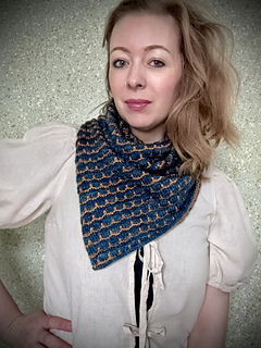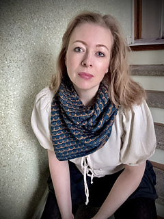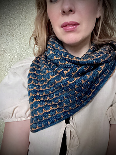 The pattern consists of three parts which are lined with an icord edge, and seamed together in the end to create a loop scarf that can be worn very easily.