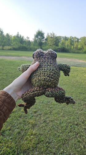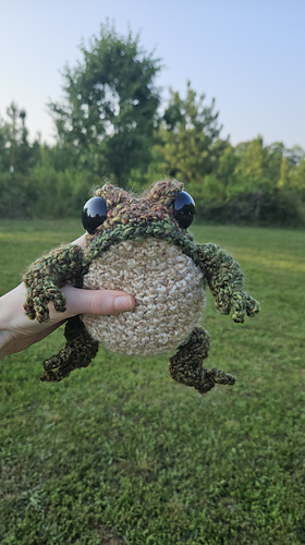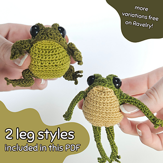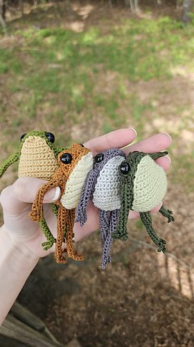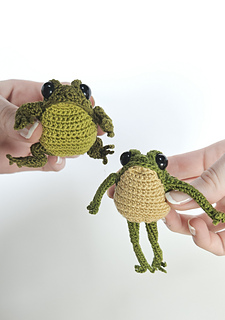 The green & copper standing toads pictured above were created using a .5mm hook and measure about 4.25” tall. The green frog has 10mm safety eyes while the copper one has 9mm eyes. The purple toad was created with a .75mm hook and has 12mm eyes and measures about 5” tall. All are made with 6-strand embroidery floss.