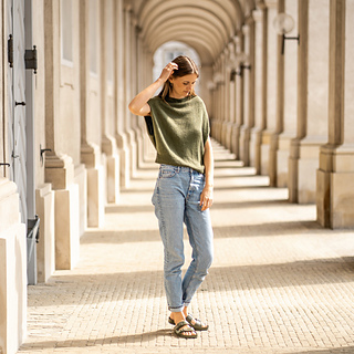 An oversized tee, worn with a positive ease of 15 to 30 cm. If you’d like it a little more fitted, you can easily go down one size. If you’d like it even more spacious, go one size up.