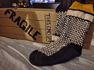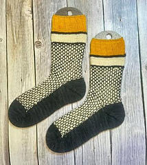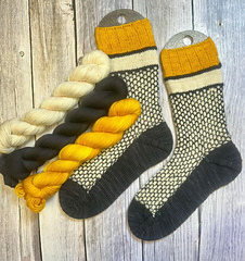 The socks are knit from the cuff down and are comfortably stretchy. There are several different techniques required to construct the pattern. Most of the techniques can also be found on Youtube if needed though. Once the first sock is done, the second is even easier to knit.