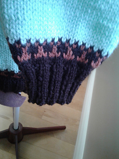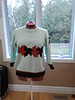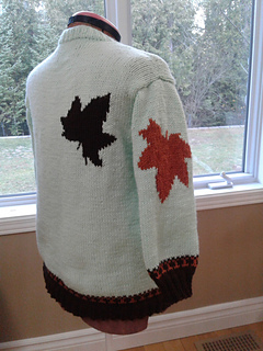This Unisex pullover sweater has a crew neck, long sleeves with fair isle above cuffs and bottom ribbing. Intarsia design of 4 leaves across Front, one leaf on Back and on each sleeve. 30”/76cm to 40” /102cm chest