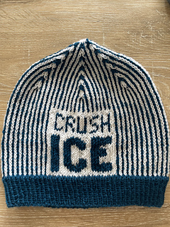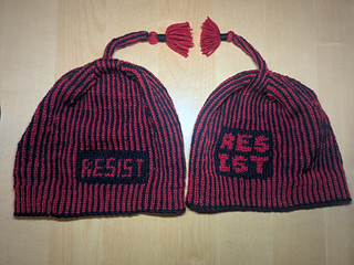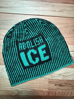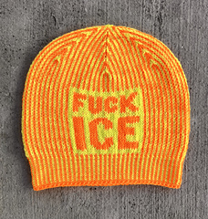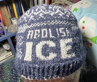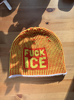 The pattern includes two charts, one that reads “Abolish ICE” and the other that reads “Fuck ICE”. Also included are extensive round-by-round notes, as well as recommended tutorial videos. A section of samples shows a variety of yarns used, fiber information, needles used, final weight, and notes on the particular yarn from myself and testers. Further notes go over sources of low-cost natural yarns as well as how to substitute yarns. Happy knitting!