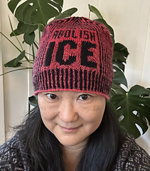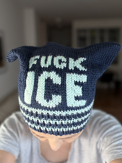 The pattern includes two charts, one that reads “Abolish ICE” and the other that reads “Fuck ICE”. Also included are extensive round-by-round notes, as well as recommended tutorial videos. A section of samples shows a variety of yarns used, fiber information, needles used, final weight, and notes on the particular yarn from myself and testers. Further notes go over sources of low-cost natural yarns as well as how to substitute yarns. Happy knitting!