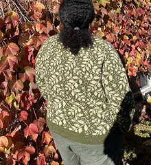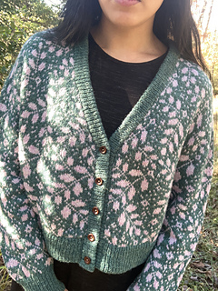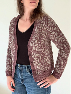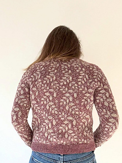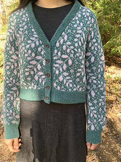 The “Acacia Leaf Cardigan” is knit from the top down, featuring a round yoke and a steek.