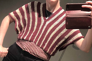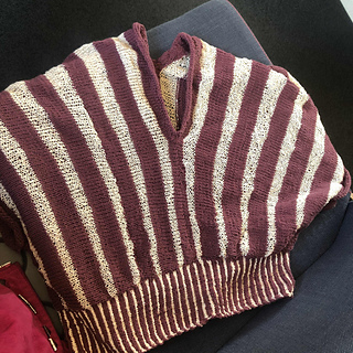 Accordion top is a loose fit summer top inspired by musical instrument, accordion. This airy garment features continuous vertical stripes with wide-narrow transitions, integrated body and large sleeves, front & back v-neck and 2-color wide ribbing trim.