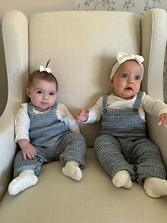 The dungarees are worked from the bottom one leg at a time and then joined together in the crotch. The body part is worked in a round.