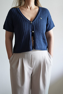 The cardigan is worked top-down, starting from the back shoulders. First, short rows are used to shape the shoulders, then the back is worked down to the underarms. Stitches are picked up from the shoulders to work the fronts. The armholes are shaped while forming the V-neck neckline, and the body is then joined at the underarms and worked in one piece. Stitches are picked up along the front edges to knit the button bands. Finally, the sleeves are worked in the round from the armholes, and buttons are sewn on to finish.