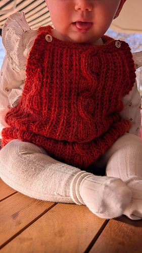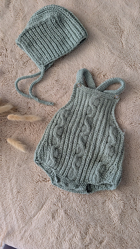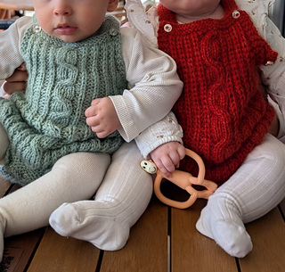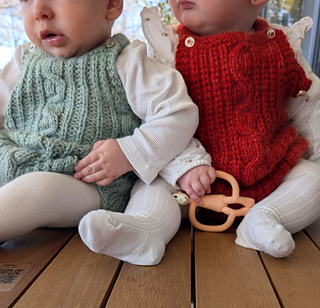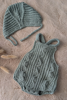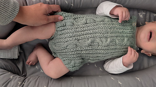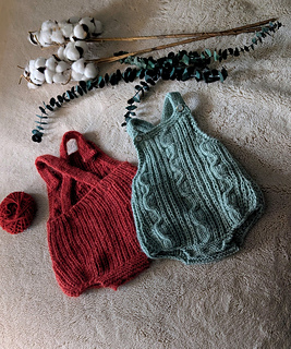 This top-down romper pairs cables with half fisherman’s rib for a stretchy, comfortable fit. It features adjustable cross-back straps that travel from the back to the front bib, offering two height options to grow with the baby.