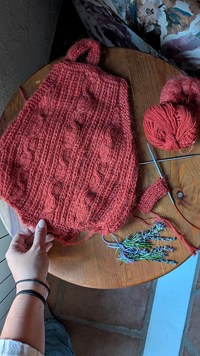 The red sample is knitted using KFO merino held double + one strand of mohair.