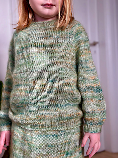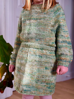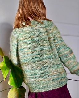 Aeris Sweater Junior (Latin: “air”) is a simple, lightweight and quickly knitted sweater. The sweater is knitted in a combination of sock yarn and mohair which makes it wear-resistant and perfect for everyday use. The sweater is worked in the round, from the top down with both raglan increases and German Short Rows, both on the neck and at the bottom of body which gives the neck of the sweater a rounded fit and equal length both on the front and back. The sleeves are worked in the round on double pointed needles or by using Magic Loop Technique.