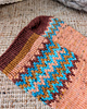 Pattern sample knit in The Wool Seeker Lydia (80% superwash merino/20% nylon) in the stunning “Noel en Afrique” colorway with coordinating contrasts.
