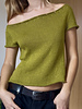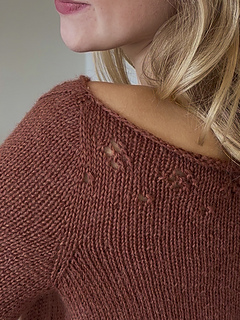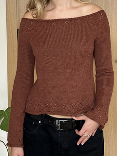 The Agnes Tee is a relaxed tee with a boat neckline that can be worn off the shoulder. It is worked seamlessly, in the round, from top to bottom. It mimics the look of set-in sleeves by increasing in the shoulder area. The tee features a tulip lace pattern around the neckline, the sleeves and the bottom hem. It can be made with short or long sleeves, with long sleeves flaring out towards the end.