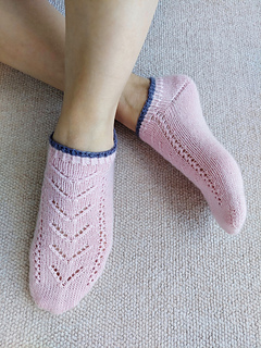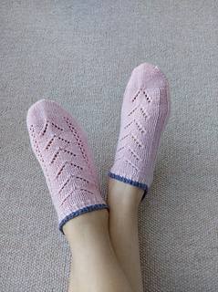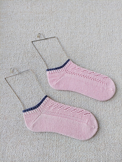 Airflow Lace踝襪使用長輪針從腳趾開始編織。兩款簡單的蕾絲圖樣,搭配德式引返腳跟。簡易的針法很適合織襪新手,可以快速完成。