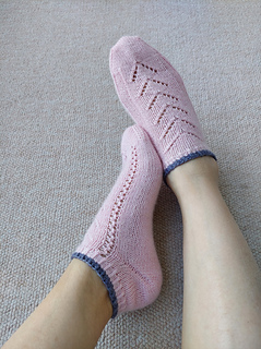 This is a toe-up ankle sock pattern, worked with long circular needle using the magic loop method. The socks feature a simple lace pattern on the instep, of which there are two versions. Written instructions and chart are included. The heel is shaped by German short rows, and topped off with a half twisted rib cuff.