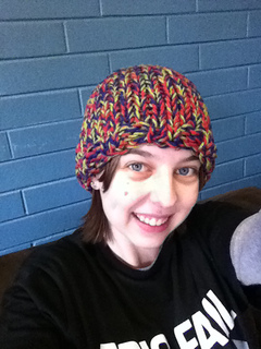 I tend to work most nights up in the city and this time of year in Australia it can get a little nippy at night. Between work and my place I’ve got to walk to my car, drive with no working heater and walk from the car park at my place to my flat. It can get quite chilly! I’ve got a few scarves that I rotate between each night and it suddenly dawned on me that I don’t have something to keep my poor head warm. So armed with my 12mm bamboo needles (the bigger needles are better for my dodgy wrists) and 3 balls of Moda Vera’s Cupcake in purple, pink and green I started knitting Aisha. I sort of made it up as I went along and now here it is for you all!