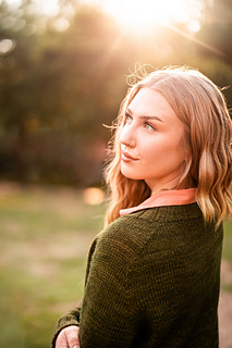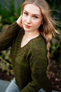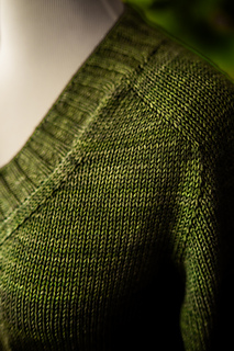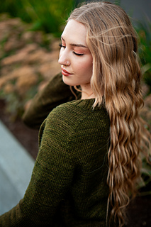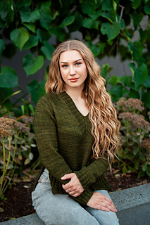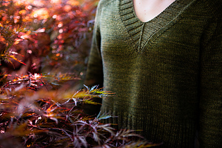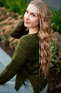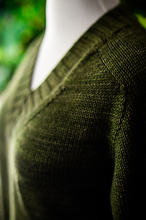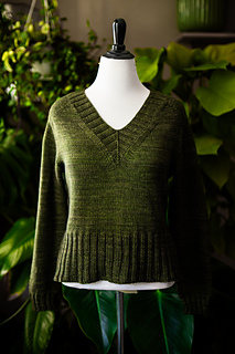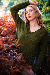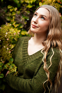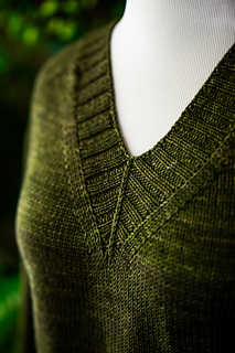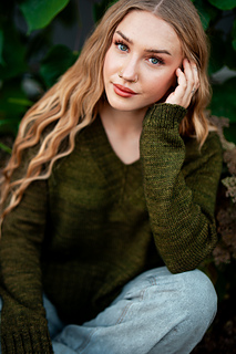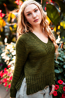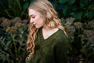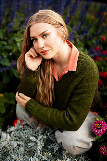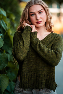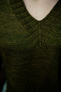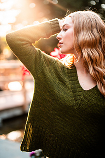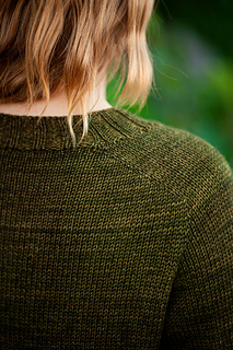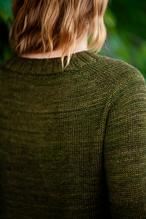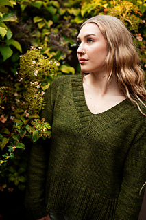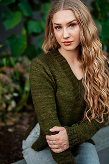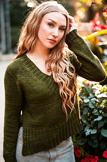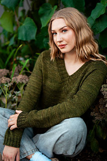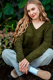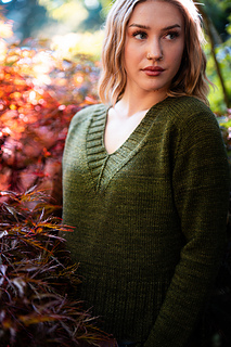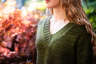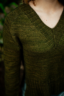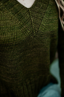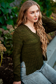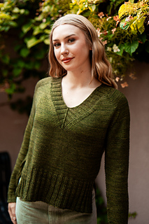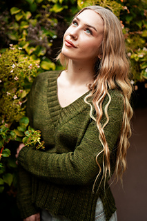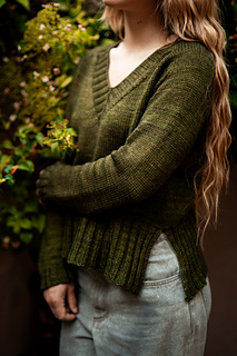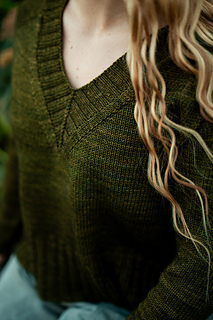 You’ll begin flat, shaping the front and back necklines as you go, then join in the round once the yoke is complete. The body continues in stockinette with an optional long split hem in 2x2 ribbing. Sleeves are picked up and knit in the round, finished with matching rib cuffs. Finally, stitches are picked up around the neckline for a softly structured 2x2 V-neck collar.