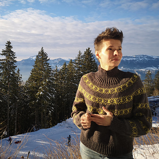 The top three rows of white motifs in this sweater design are further apart towards the shoulders to create a visually “embracing” effect around the shoulders. This subtle widening of the distance improves the shape of the yoke, pulls the eye in the middle and gives the impression that the sweater wraps gently around the shoulders, adding both warmth and a flattering, cozy silhouette.