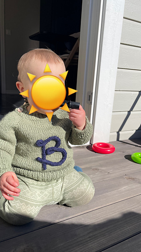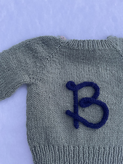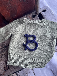 En tidløs barnegenser i størrelser fra 6 måneder til 6 år. Genseren strikkes ovenfra og ned i glattstrikk med klassiske raglanøkninger for god passform. Den får et personlig preg med forbokstav sydd på med i-cord-snor.