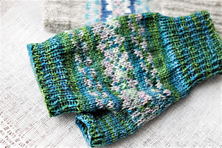 The mitts are for knitting in the round and use one main colour with up to an additional 6 contrast colours. The mitts are interchangeable for each hand.