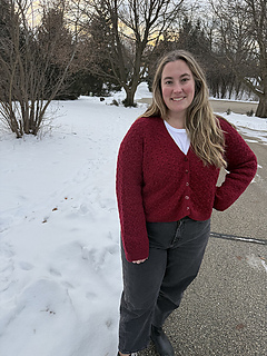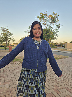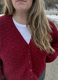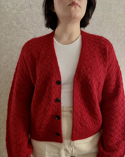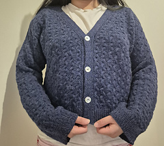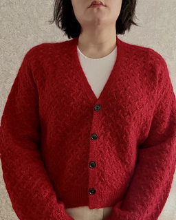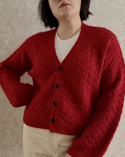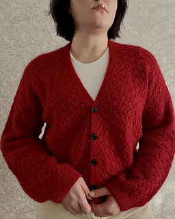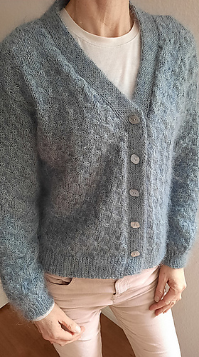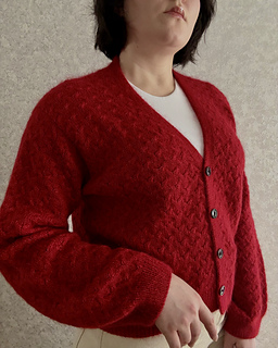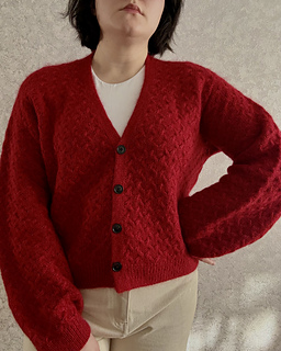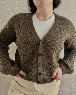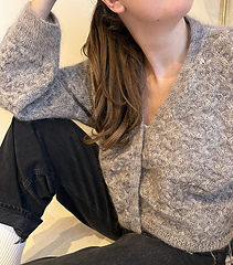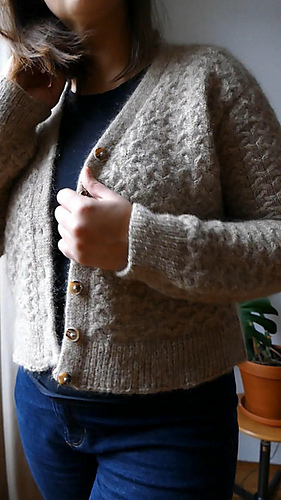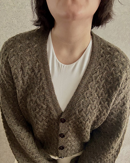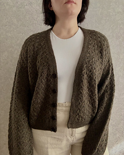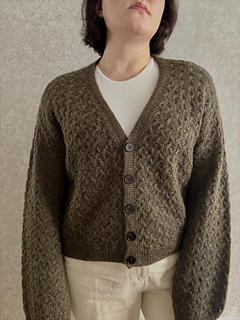Almaz cardigan is knitted top-down in a modified drop shoulder construction, featuring an all-over easy-to-memorize cabled stitch pattern with a V-neck detail. The shoulders are meant to have a gentle drop past the outer point of the shoulder.