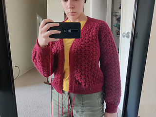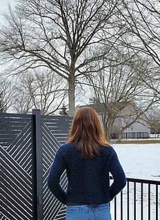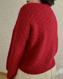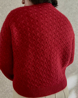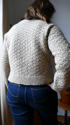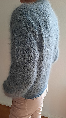 Shaping around the shoulders and on the sleeve caps is achieved through German short rows applied in the stitch pattern. Step-by-step instructions for the short row shaping are provided in the pattern. However, some parts of the pattern are charts only, so some familiarity with reading knitting charts is required. Both the sleeve and body length from the underarm to the hem can be adjusted to the knitter’s liking.