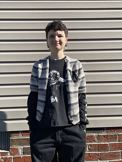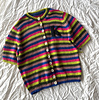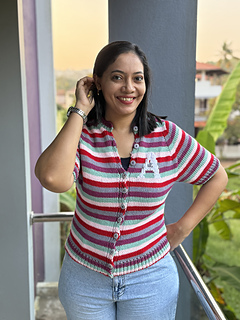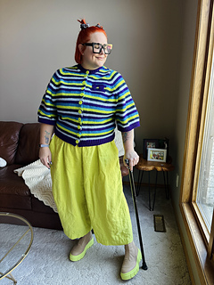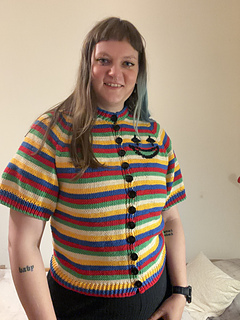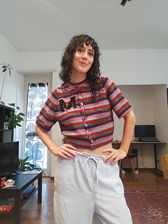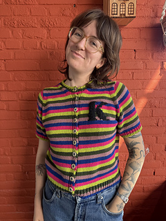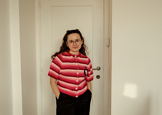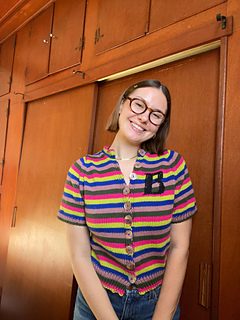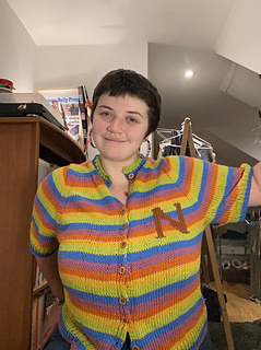 This is a knitting pattern suitable for intermediate knitters. The pattern uses the duplicate stitch technique to add a letter onto the jacket, which is a type of embroidery that looks like knitting. The jacket has short sleeves, buttons down the front and a crew neck neckline. The sweater has a 5-10 centimetre positive ease, meaning the bust of the sweater is 5-10 centimetres bigger than the bust of the person wearing it. This jacket can be made for any gender in sizes XS through 5XL. The instructions are written per size, like so XS (S) M (L) XL (XXL) 3XL (4XL) 5XL.