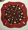 An 8 inch lacy snowflake square made with worsted weight yarn in two colors.