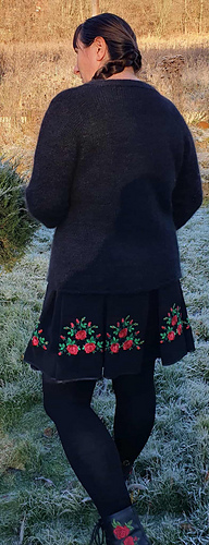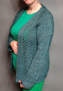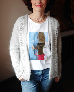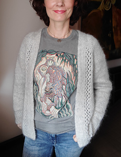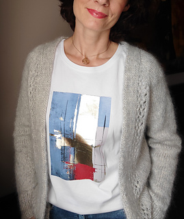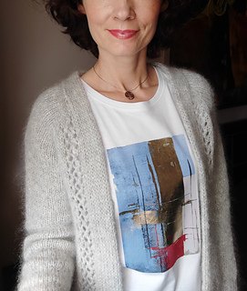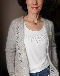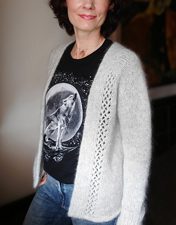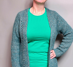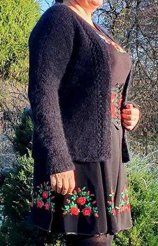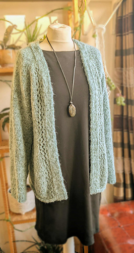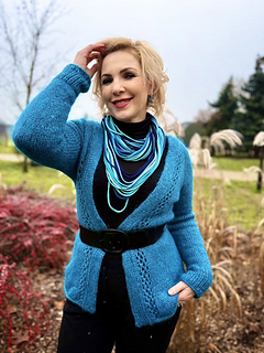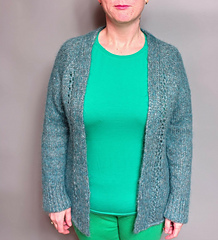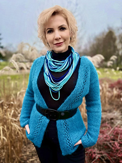 The cardigan is worked flat, top-down, in one piece without any seaming. The main needles are 6 mm (US 10).