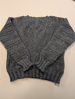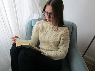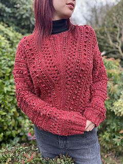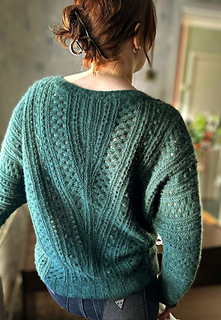 The sleeves are worked top-down in the round, allowing you to try on as you go and adjust the length as needed. Stitches are then picked up for the ribbing and neckline, which are both worked in the round to the bind-off.