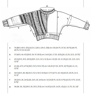 To check your gauge for the textured pattern that runs throughout the sweater, a Gauge Swatch Chart is included in the pattern; 18 sts x 33 rows of the Chart on Needle A = 10 x 10 cm / 4 x 4”.