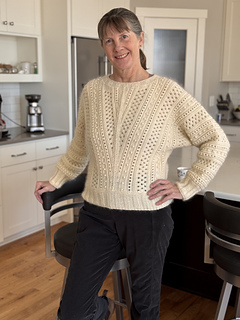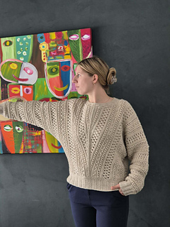 This design works well with a wide range of DK-weight yarns. For a warm-weather version, choose a plant-based fiber such as cotton or linen (blend). For a cozier, more insulating sweater, a wool or wool-blend yarn is ideal.