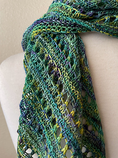 This shawl measures about 43.5(75)“/1.1(1.9)m across the wingspan, and roughly 18(32)”/45(81)cm deep through the center point. The sample shown is the smaller version. It’s very easy to customize this shawl to your individual preferences.