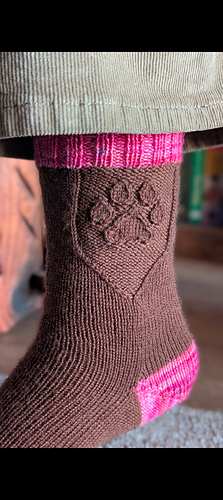 These are toe-up socks, using techniques such as Judy’s Magic Cast-on, short rows for the heel and some 2 stitch cables for the charted paw motif. There are written instructions for the construction of the sock, and a chart for the paw print motif and surrounding crest. Video links are included for demonstration.