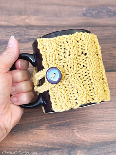 The simple cables add a touch of elegance to your favorite cup or mug. Worked in the round or flat, this pattern provides a rewarding challenge for your knitting skills.