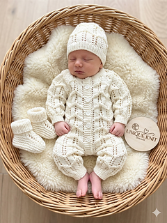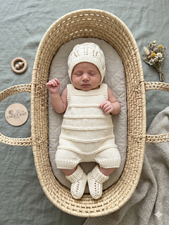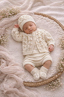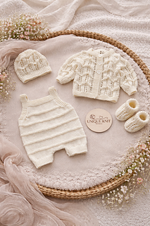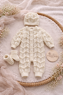 Top-Down Construction: Both the cardigan and the full-length romper are knitted in one piece from the top down. This means minimal finishing work and no bulky seams, ensuring maximum comfort for the baby and a smoother knitting experience for you.