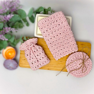Create a luxury handmade spa bath set with this 4-in-1 crochet pattern bundle PDF — featuring a textured bath mitt, matching soap saver bag, reusable face scrubbies, and coordinating storage basket.