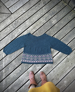 Gearbeitet wird der Pullover nahtlos von oben nach unten, wobei zunächst der V-Ausschnitt mit eingearbeiteten, verkürzten Reihen gestrickt wird. Dies ermöglicht einen schöneren Sitz des Ausschnitts. Die Rundpasse entsteht durch unsichtbare Zunahmen. Im unteren Teil wird mit einer zweiten Farbe das verschlungene Blumenmuster gearbeitet. Die Ärmel werden anschließend ebenfalls von oben nach unten gestrickt und können in der Länge (ebenso wie der Körper) ganz individuell angepasst werden.