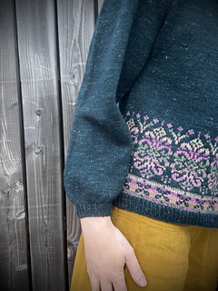 The sweater is worked seamlessly from the top down, beginning with the V-neck including integrated short rows. This ensures a more refined fit of the neckline. The yoke is formed through invisible increases. In the lower section, the interlaced floral motif is worked in a second color. The sleeves are then also knitted from the top down and, like the body, can be individually adjusted in length.