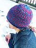Red and gray/blue hat shown in Adult L using Spirit Trail Fiberworks Birte in Dark-Eyed Junco (Color A) and Bog Cherry (Color B)