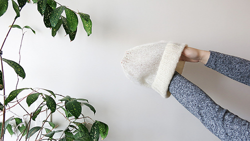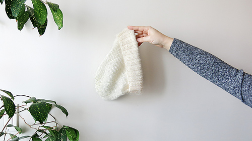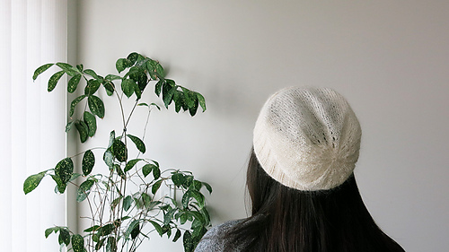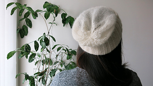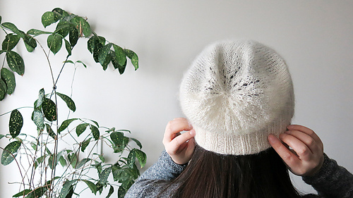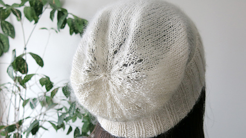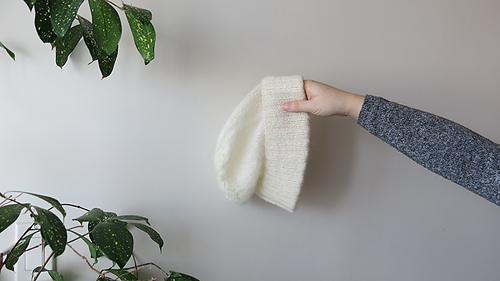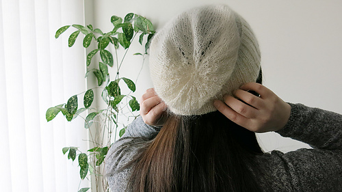 Body stockinette stitch with two strands of Shibui Silk Cloud held together, which makes the beanie semi transparent