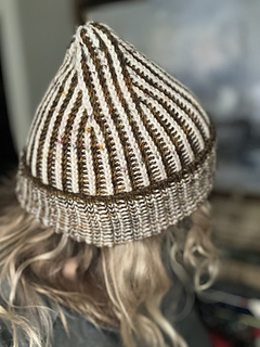 3 different head circumference sizes. Regular length for a modern raised beanie look, or Long length that allows for a generous folded brim. In addition, the brim can be worked in a solid color, if preferred. Unique stitch pattern allows the wearer to wear either of the sides as public, featuring vertical patterning on RS, and marled horizontal striping on the WS. Decorative crown shaping can be rotated to be featured in front or rotated for an arched look instead. Two crown finishing methods are included as well – cinched or square.