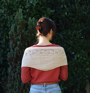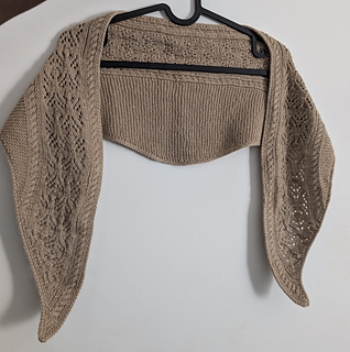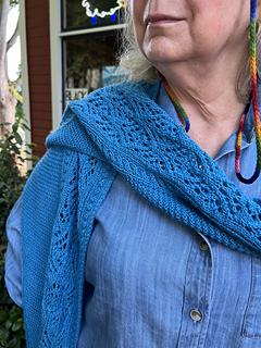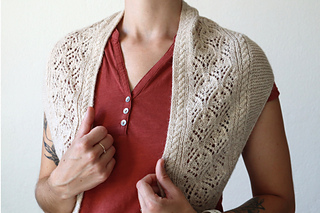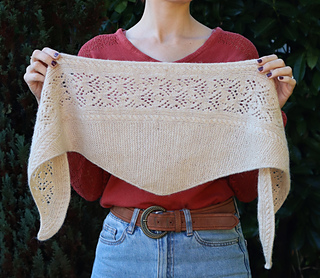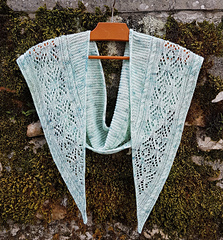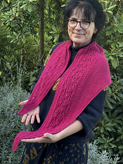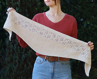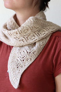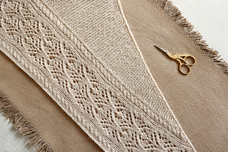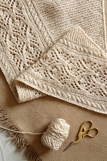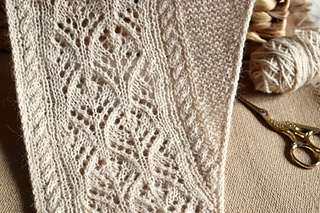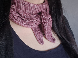 The lace pattern and cables run along the longest side of the scarf. Increases are made on the right side of the tip of the scarf until the desired width before decreasing back to the other tip of the scarf.