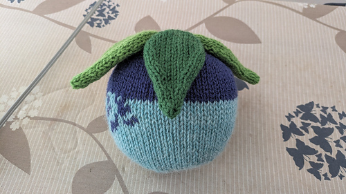 what you need for this project: blue yarn (main body), green yarn (leaves), straight knitting needles, a sewing/darning needle, stuffing.
