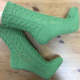 Bei der Socke *Andrea* wechseln sich klassische Zöpfe mit einem rautenförmigen Muster aus verkreuzten Hebemaschen ab. Beide Muster werden über den Oberfuß bis zur Spitze fortgesetzt und sorgen für Abwechslung beim Stricken.