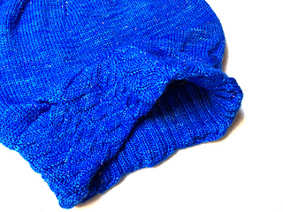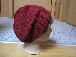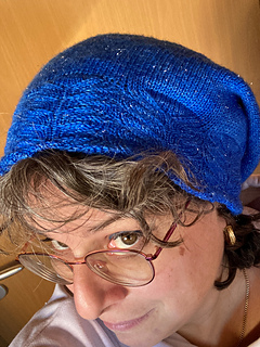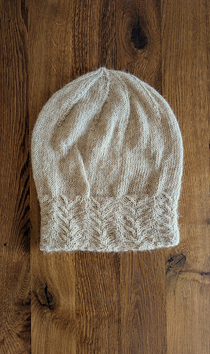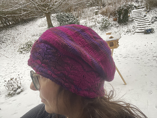 Nemesia is a hat with a close-fitting, double headband (patterned on the outside, ribbing on the inside) and a loose-fitting crown. The hat is knitted in one piece without seams.