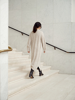Anette is a boldly ribbed but simple raglan dress with generous proportions. Using blown yarn with alpaca and wool makes this over-sized dress light and fluffy. The dress is knitted top down and features a simple turtleneck. Narrow ribbed panels run down each side from the underarm, forming overlapping slits on both sides at the hem. The inspiration behind the design came from a wide ribbing texture that Sara Markkula spotted everywhere: on the streets and social media, in magazines and stores. The mane of the design comes from her family tree.