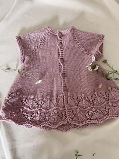 It is designed to be worn with the opening at the back, but can also be worn as a front-buttoned cardigan, or knitted longer and worn as a dress. Instructions are given for both short and long sleeves.